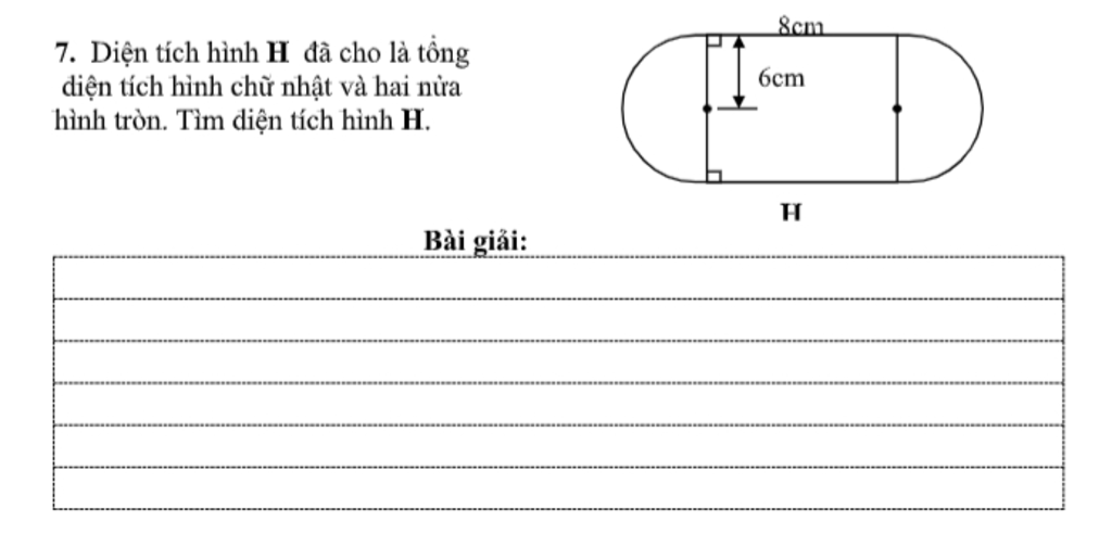 Hai nửa hình tròn ghép lại được 1 hình tròn có bán kính 6cm.