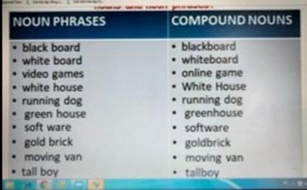 A compound noun is a noun phrase made up of two nouns, e.g. bus driver, in which the first noun acts as a sort of adjective for the second one, but without really describing it. ... Compound nouns can be made up of two or more other words, but each compound has a single meaning.