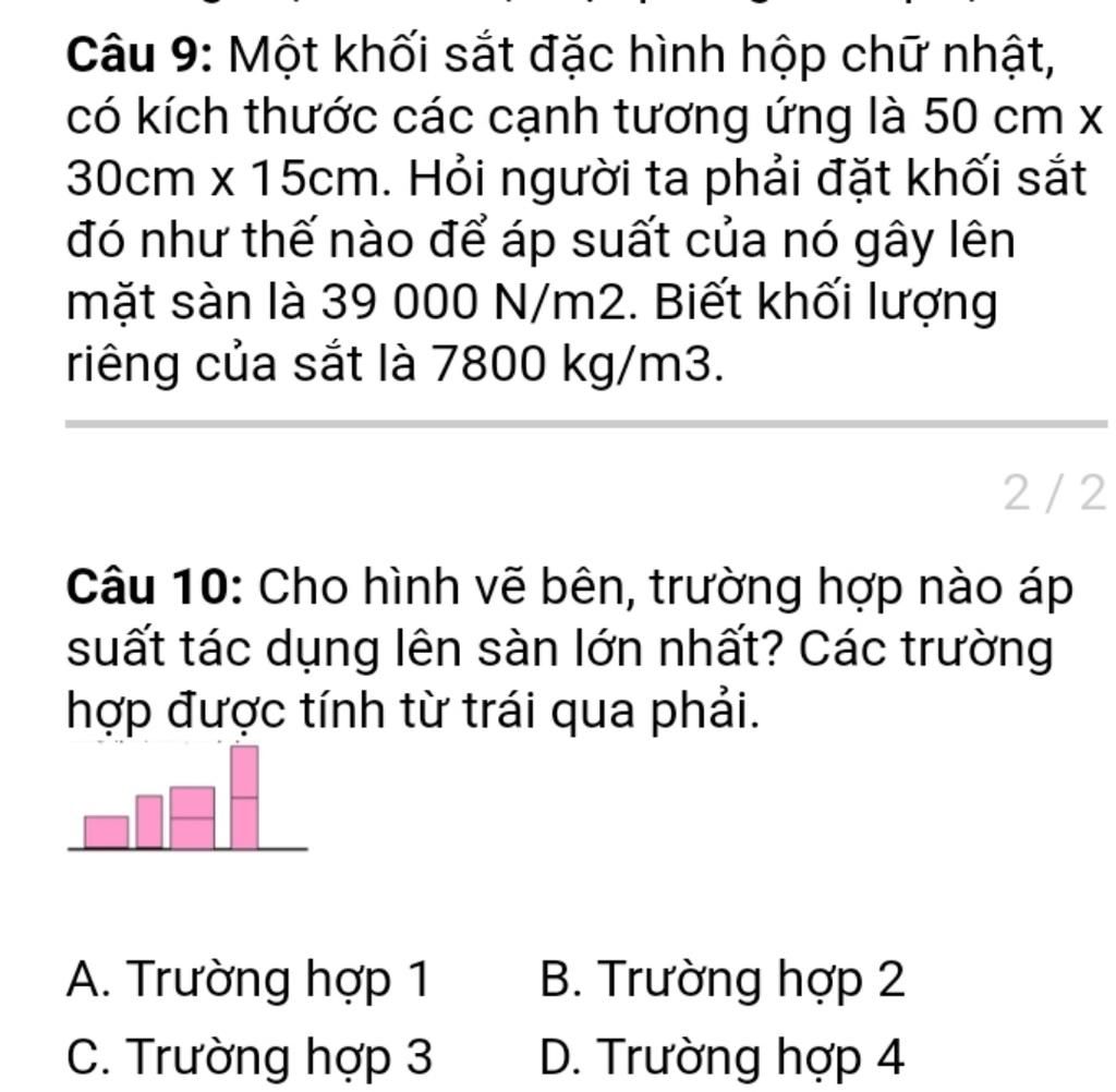 Vậy người ta phải đặt đứng khối sắt để áp suất của nó gây lên mặt sàn là 39000 N/m2m2