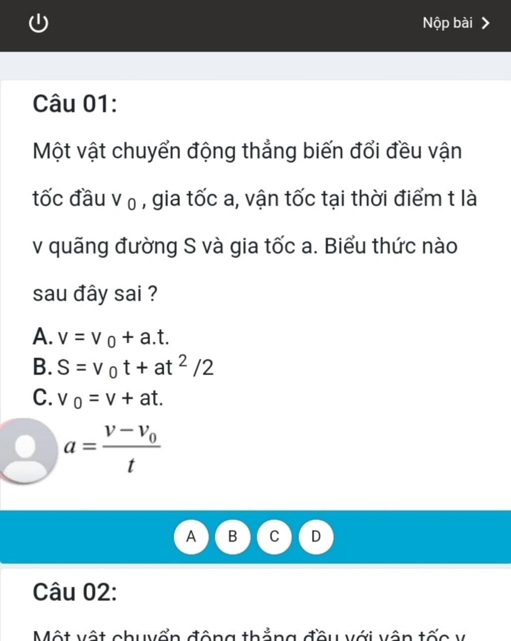 mà câu C có `v_0 = v + a t` ⇒ sai
