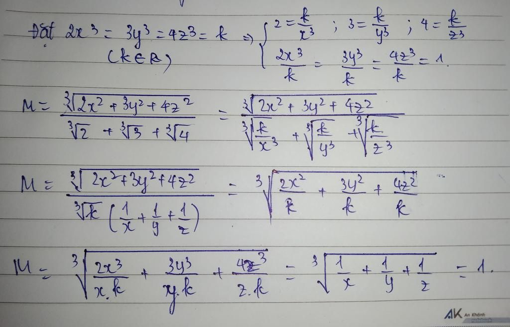 $ => k.M = \sqrt[3]{2x^{2} + 3y^{2} + 4z^{2}} = x\sqrt[3]{2} = y\sqrt[3]{3} = z\sqrt[3]{4}$