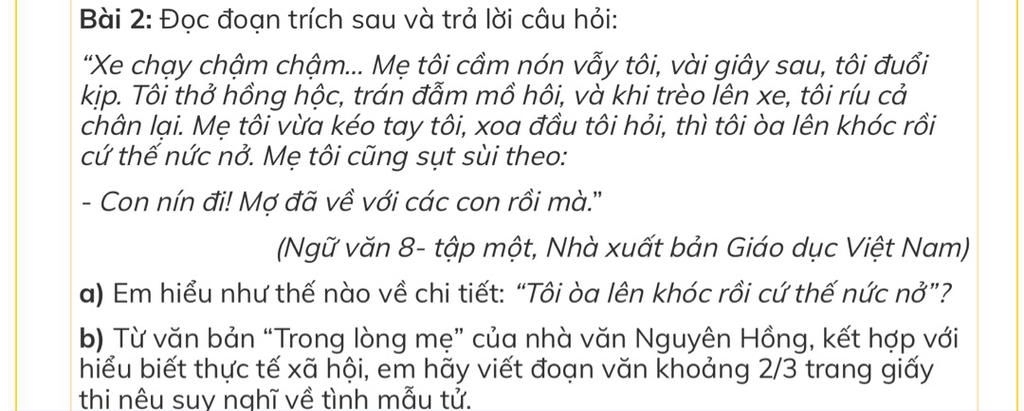 câu 2:qua nhiều tác phẩm của nhà văn Nguyên Hồng, tất cả mỗi chúng ta đều có thể nhận thấy rằng chất liệu chủ đạo mà ông sử dụng cho sáng tác của mình được lấy từ cuộc sống của những con người khốn khó hay của chính mình. Hồi kí Những ngày thơ ấu của ông cũng là một trong những tác phẩm như vậy. Tình mẫu tử như một sợi chỉ đỏ xuyên suốt toàn bộ đoạn trích Trong lòng mẹ của hồi kí này.