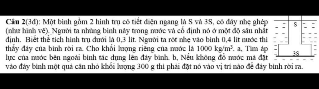Câu 2(3đ): Một bình gồm 2 hình trụ có tiết diện ngang là S và 3S, có đáy nhẹ ghép (như hình vẽ). Người ta nhúng bình này trong nước và cố định nó ở một độ sâu nhất định. Biết thể tích hình trụ dưới là 0,3 lít. Người ta rót nhẹ vào bình 0,4 lít nước thì thấy đáy của bình rời ra. Cho khối lượng riêng của nước là 1000 kg/m3. a, Tìm áp lực của nước bên ngoài bình tác dụng lên đáy bình. b, Nếu không đổ nước mà đặt vào đáy bình một quả cân nhỏ khối lượng 300 g thì phải đặt nó vào vị trí nào để đáy bình rời ra.