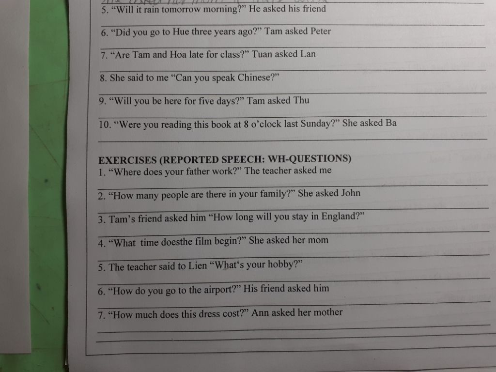 7. Tuan asked Lan if Tam and Hoa were late for class.