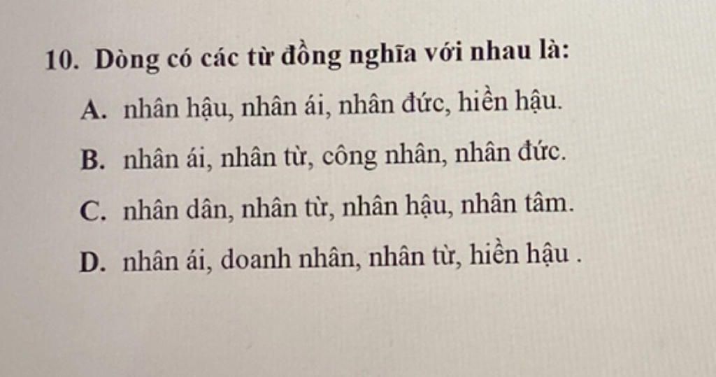 A. nhân hậu, nhân ái, nhân đức, hiền hậu