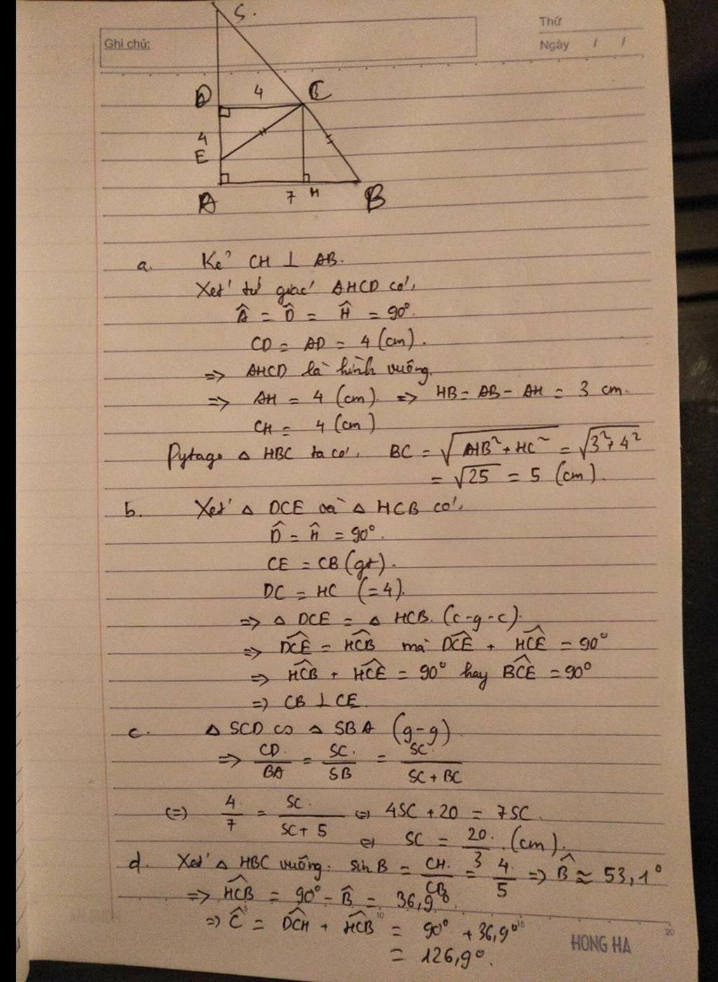 Bài 2: Cho hình thang vuông ABCD vuông ở A và D có đáy AB = 7 cm CD = 4 cm AD = 4 cm. a) Tính cạnh bên BC. b) Trên AD lấy E sao cho CE = BC. Chứng minh EC vuông góc với BC và tính diện tích tứ giác ABCE. c) Hai đường thẳng AD và BC cắt nhau tại S tính SC. d) Tính các góc B và C của hình thang.(2 điểm)