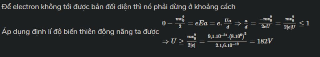Một electron bay vào điện trường của một tụ điện phẳng theo phương song song cùng hướng với các đường sức điện trường với vận tốc ban đầu là 8.106 m/s. Hiệu điện thế giữa hai bản tụ phải có giá trị nhỏ nhất là 182V để electron không tới được bản đối diện.