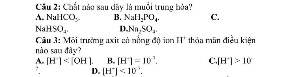 Các đáp án khác `HCO_3, H_2PO_4, HSO_4` đều là các gốc axit yếu nên sẽ tạo môi trường bazo.
