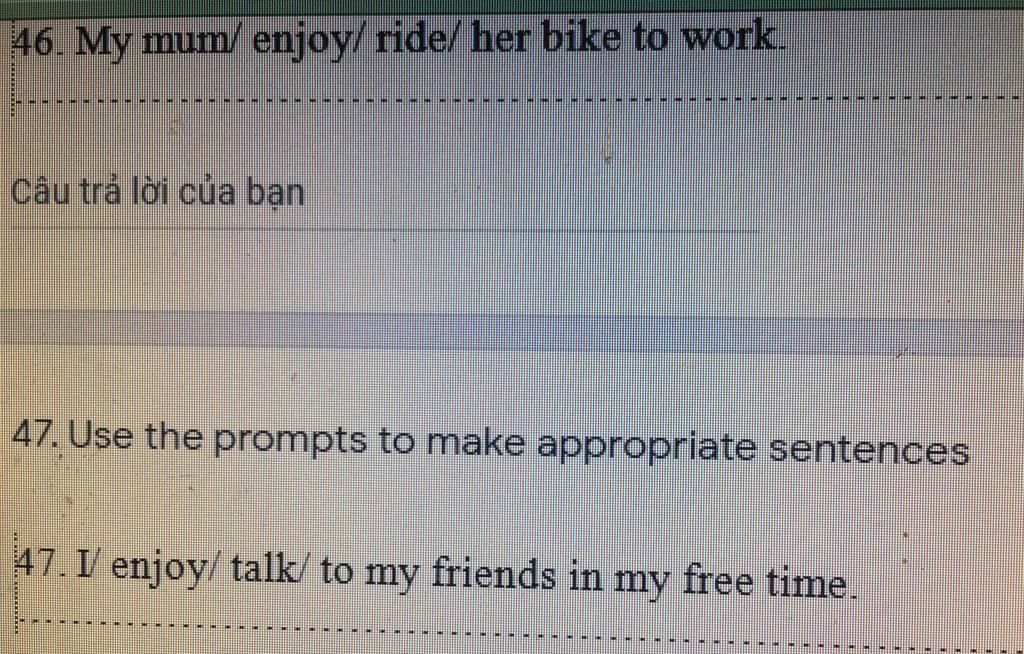 - Dịch: Mẹ của tôi thích đi xe đạp để đi làm.