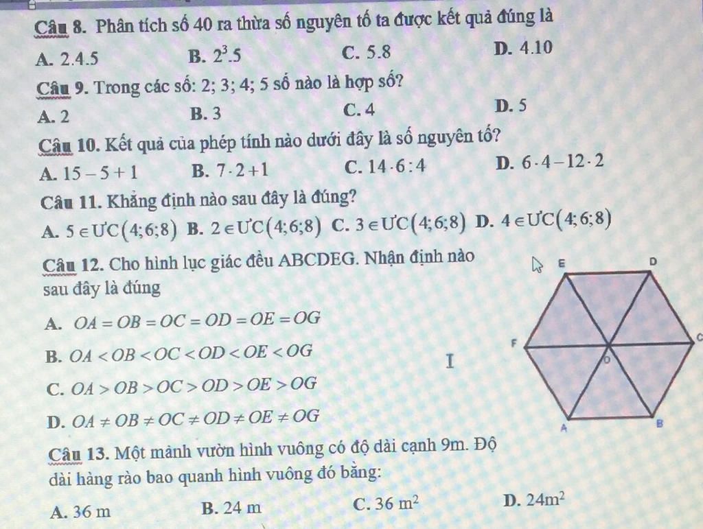 Câu 8: Phân tích 40 ra thừa số nguyên tố: