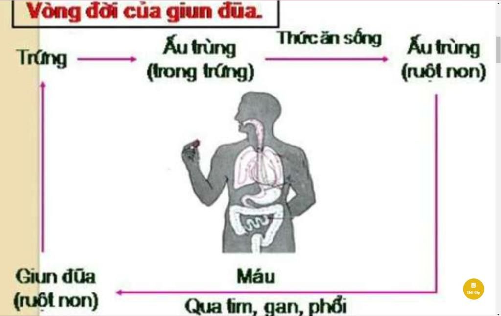 Trả lời: - giun trưởng thành => trứng => ấu trùng(trong trứng) => bám vào rau, quả sống => người ăn => ruột non (kí sinh lần 1) => ruột non => kí sinh chính thức