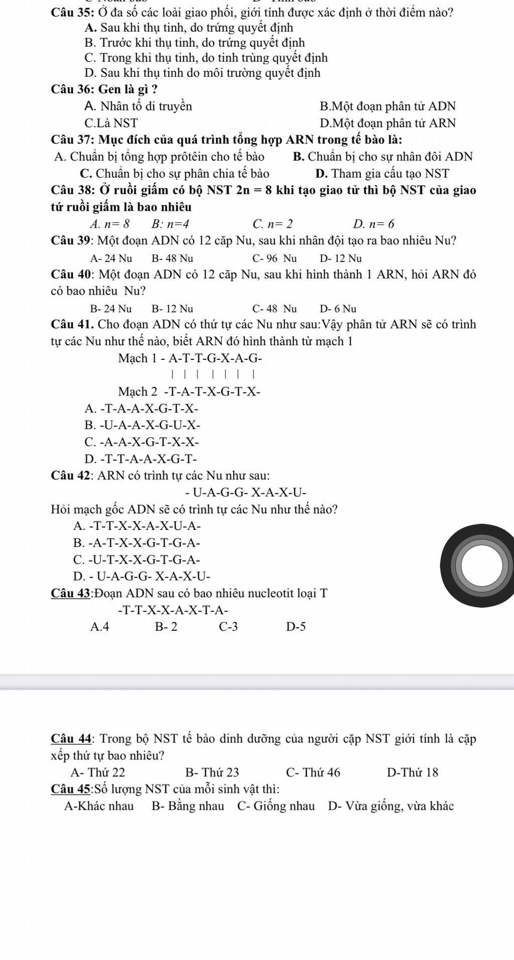 Câu 35: Ở đa số các loài giao phối, giới tính được xác định ở thời điểm nào?