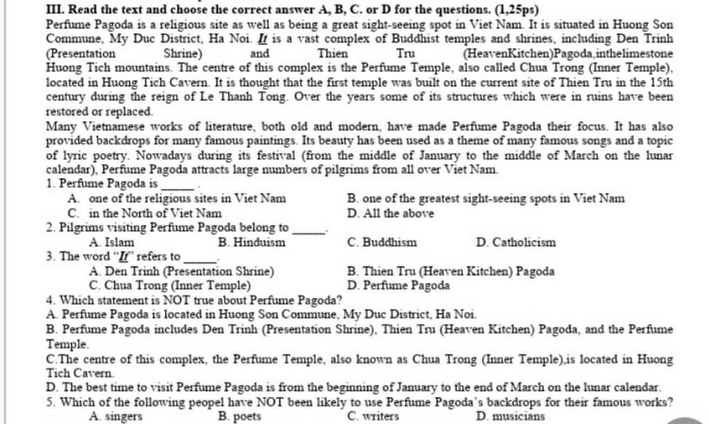 III. Read the text and choose the correct answer A, B, C. or D for the questions. (1,25ps)