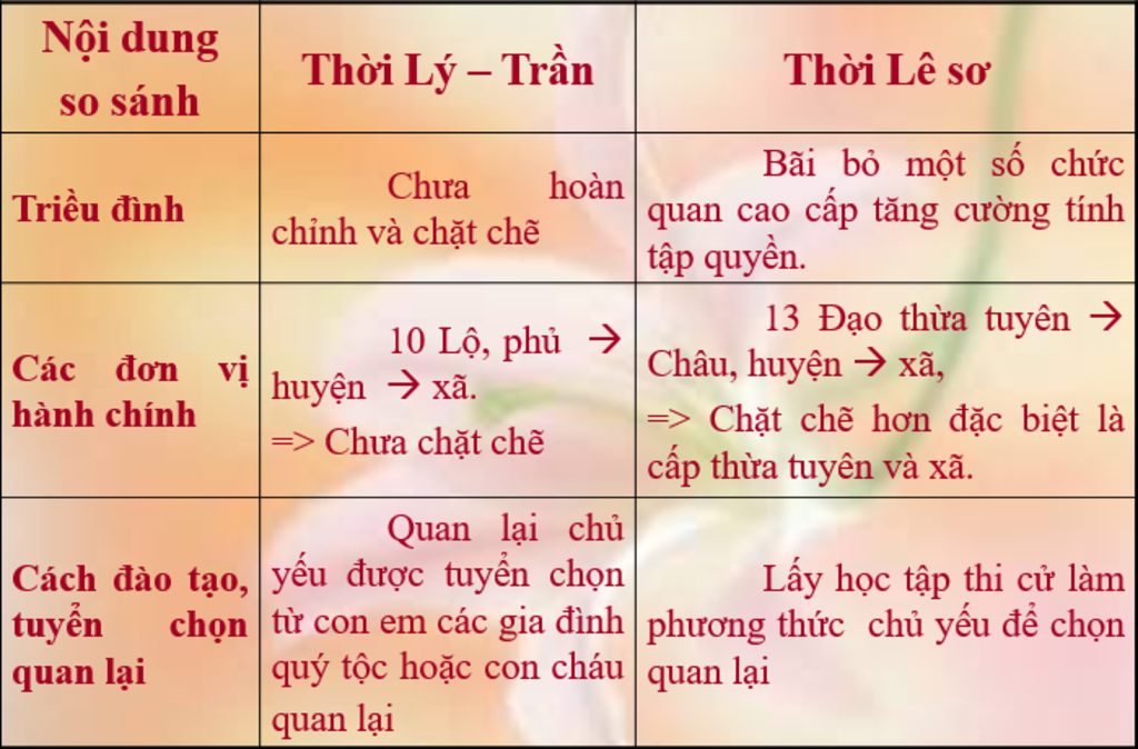 - Thời Lê sơ: quan lại chủ yếu là do khoa cử mà đỗ đạt làm quan. Tầng lớp nông nô không còn, nô tì giảm dần về số lượng và được căn bản giải phóng vào cuối thời Lê sơ, tầng lớp địa chủ tư hữu phát triển rất mạnh.