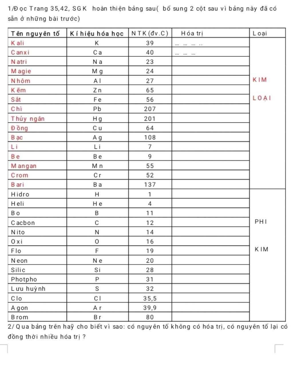 1/Đ ọc Trang 35,42, SGK hoàn thiện bảng sau( bổ sung 2 cột sau vì bảng này đã có