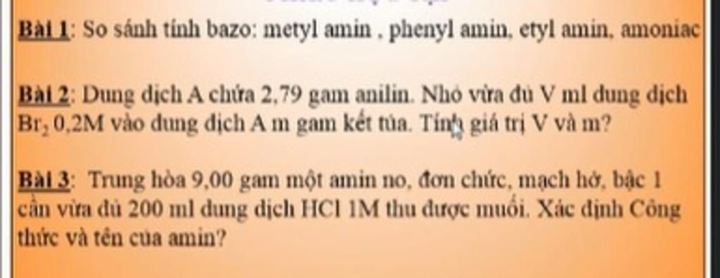 Bài 1: So sánh tính bazo: metyl amin, phenyl amin, etyl amin, amoniac