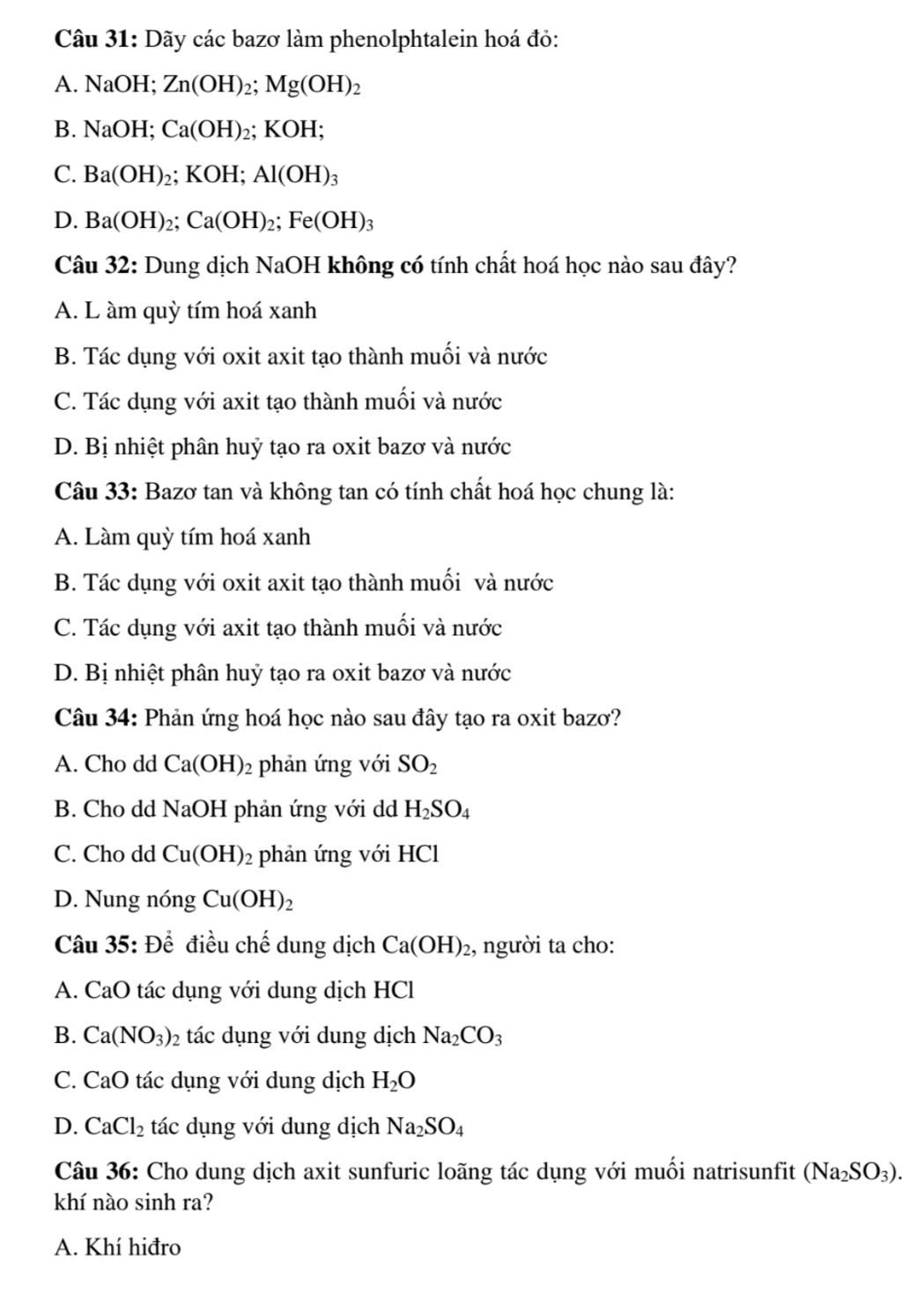 Câu 35 C vì chỉ có CaO tác dụng với nước mới tạo ra Ca(OH)2