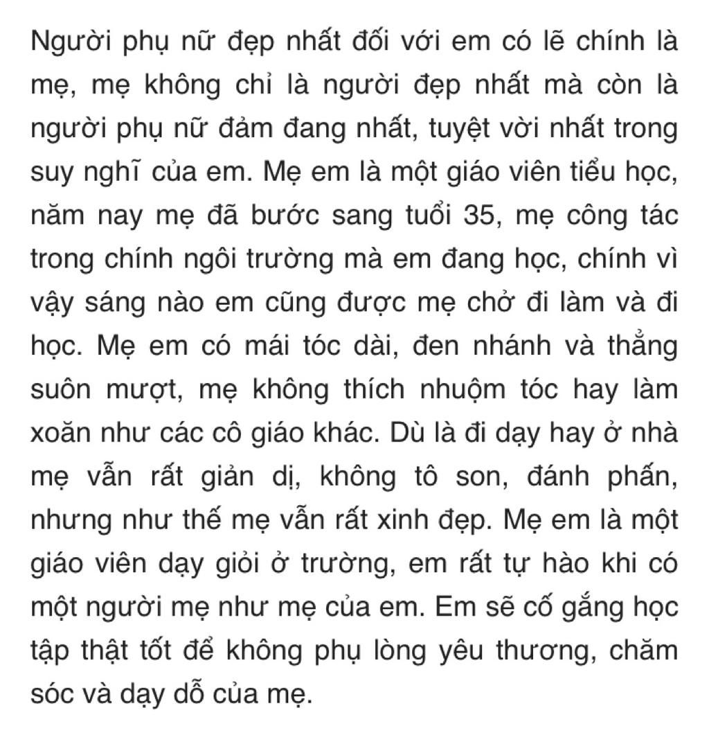Bạn yêu ai nhất? riêng tôi thì tôi yêu mẹ nhất bởi vì mẹ là người sinh ra tôi và nuôi nấng tôi nên tôi mới có được như ngày hôm nay. Mẹ tôi năm nay đã ngoài 40 tuổi nhưng nhìn mẹ vẫn còn trẻ lắm. Khuôn mặt mẹ trái xoan. Nước da rám nắng vì sương, vì gió. Mái tóc mẹ ko suôn mượt nhưng vẫn luôn sạch sẽ và gọn gàn. Đôi bàn tay mẹ có những vết chai sần vì làm việc vất vả để nuôi chúng tôi ăn học và lo cho gia đình. Mẹ là người luôn lo lắng, quan tâm cho gia đình. Mỗi buổi sáng mẹ luôn là người thức dậy sớm nấu đồ ăn sáng cho cả nhà, những món ăn mà mẹ nấu đối với tôi thì rất ngon và chan chứa tình yêu thương của mẹ đối với tôi và gia đình. Nhớ lại những lúc tôi đi chơi mà ko xin phép mẹ khiến mẹ lo lắng hớt hải chạy đi tìm tôi. Nhớ những lúc tôi ko học bài bỏ đi chơi nên điểm kém đã khiến mẹ buồn và phiền lòng. Tôi cảm thấy mik thật tồi tệ. Mẹ sẵn sàng vì tôi mà bỏ cả hạnh phúc của mik. Nhớ những lúc tôi bị ốm nằm trên giường mẹ đã thức suốt đêm chăm sóc tôi mẹ còn khóc vì sợ rằng sẽ mất tôi.Tất cả những việc đó nói lên mẹ rất thương tôi, mẹ là người tuyệt vời nhất đối với tôi .Không ai có thể hơn tình cảm của mẹ dành cho tôi cả. Tôi yêu mẹ nhiều lắm!.