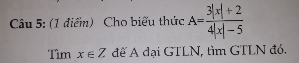 Để `A` đạt `GTLN` thì `12|x|-15` phải thuộc số nguyên dương và đạt $GTNN$
