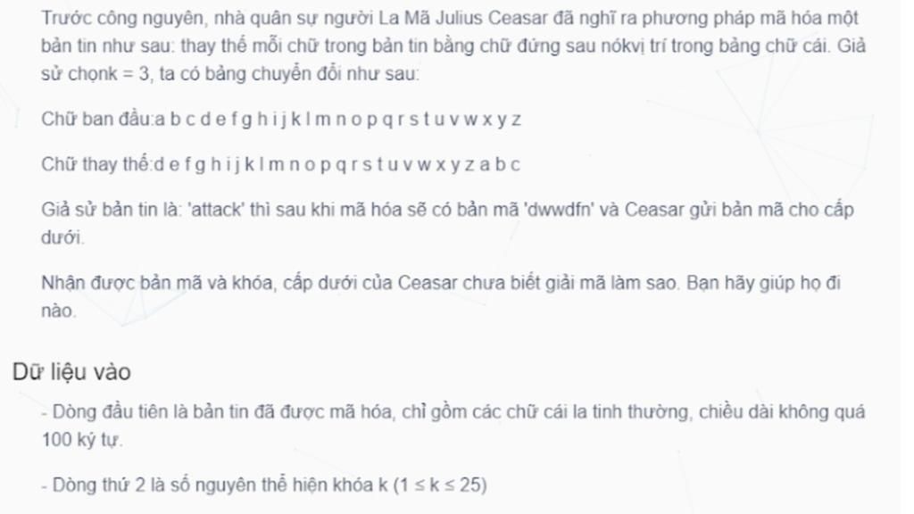 bản tin như sau: thay thể mỗi chữ trong bản tin bằng chữ đứng sau nókvị trí trong bằng chữ cái. Già