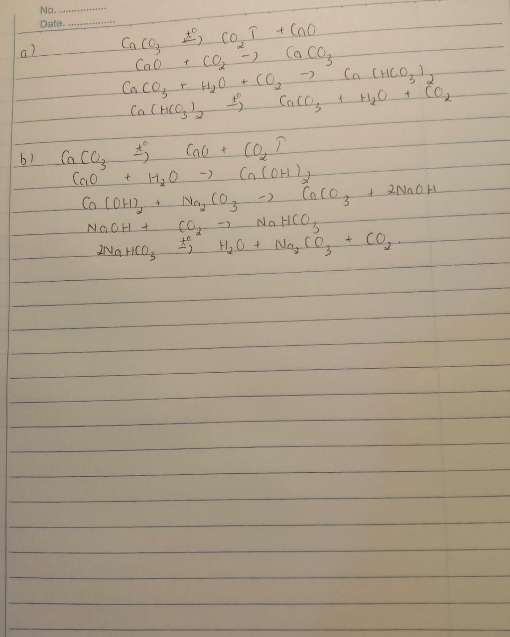 $\text{b) CaCO3$\xrightarrow{1}$CaO$\xrightarrow{2}$Ca(OH)2$\xrightarrow{3}$NaOH$\xrightarrow{4}$NaHCO3$\xrightarrow{5}$Na2CO3}$