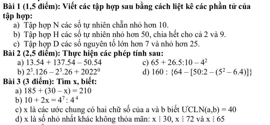 Bài 1 (1,5 điểm): Viết các tập hợp sau bằng cách liệt kê các phần tử của