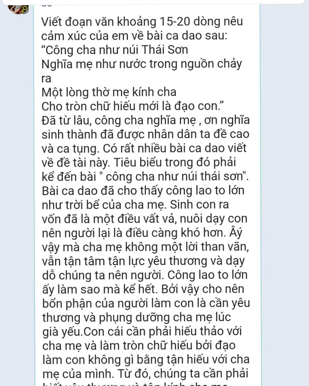 Đã từ lâu, công cha nghĩa mẹ , ơn nghĩa sinh thành đã được nhân dân ta đề cao và ca tụng. Có rất nhiều bài ca dao viết về đề tài này. Tiêu biểu trong đó phải kể đến bài " công cha như núi thái sơn". Bài ca dao đã cho thấy công lao to lớn như trời bể của cha mẹ. Sinh con ra vốn đã là một điều vất vả, nuôi dạy con nên người lại là điều càng khó hơn. Âý vậy mà cha mẹ không một lời than vãn, vẫn tận tâm tận lực yêu thương và dạy dỗ chúng ta nên người. Công lao to lớn ấy làm sao mà kể hết. Bởi vậy cho nên bổn phận của người làm