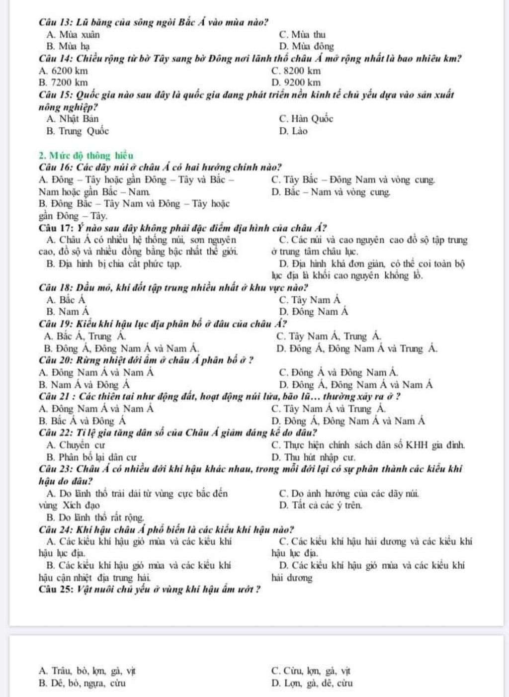 Câu 13: Lũ băng của sông ngòi Bắc Á vào mùa nào?