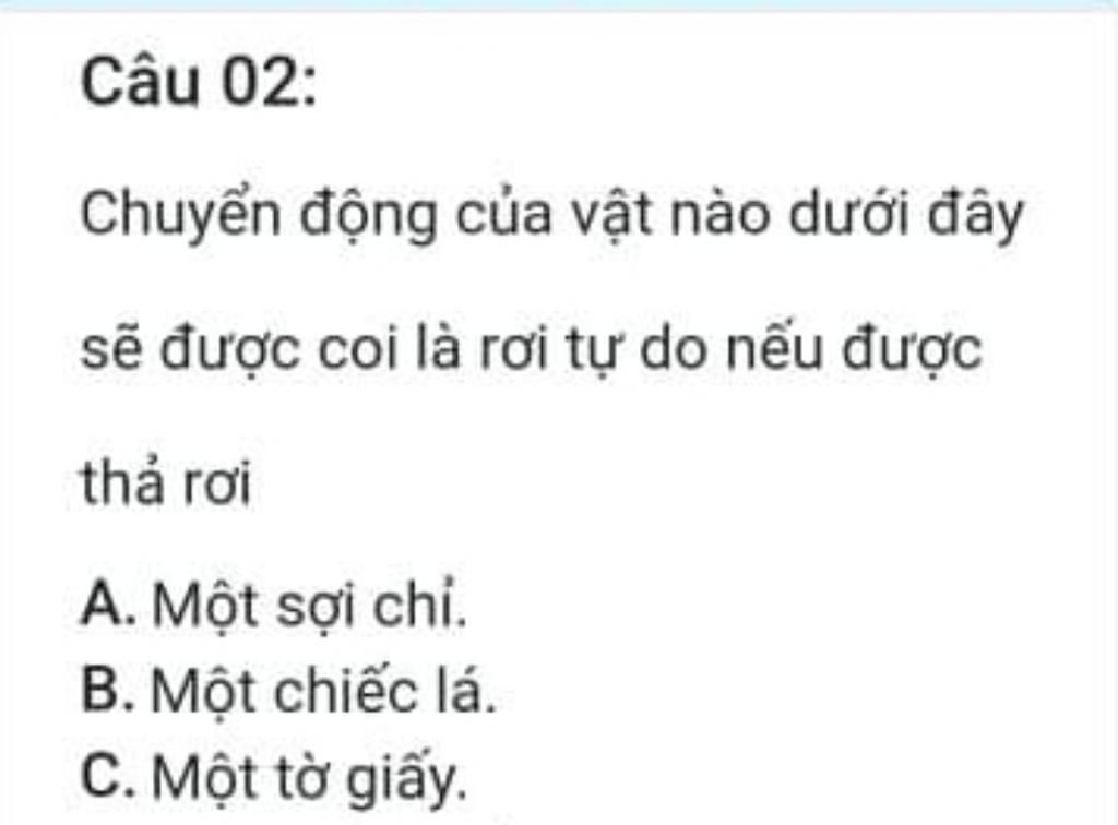 2.Không có đáp án nào đúng nha bạn nha! vì vật rơi tự do là vật rơi từ trên cao xuống theo chiều thẳng đứng. Ở đây 3 vật đều rơi không theo chiều thẳng đứng nha bạn nha