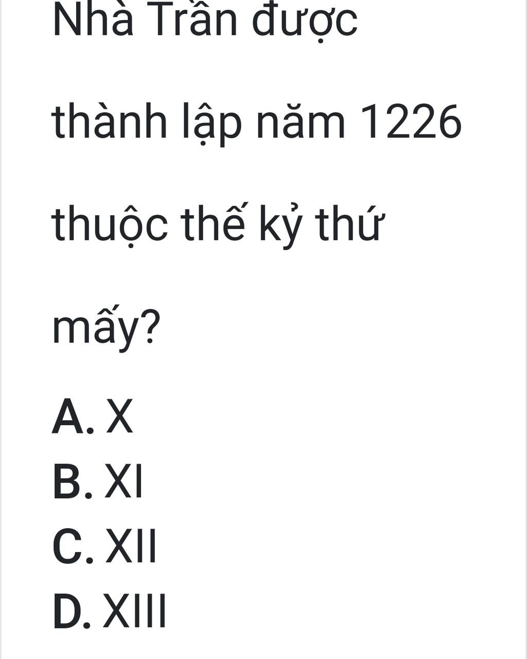 $\text{Nhà Trần được thành lập năm 1226 thuộc thế kỉ thứ XIII (thế kỉ 13)}$