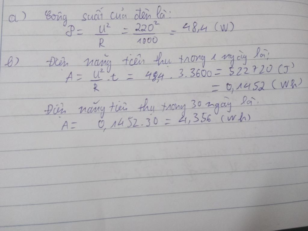 b) $A=Pt=48,4.3.30=4356Wh=4,356kWh$