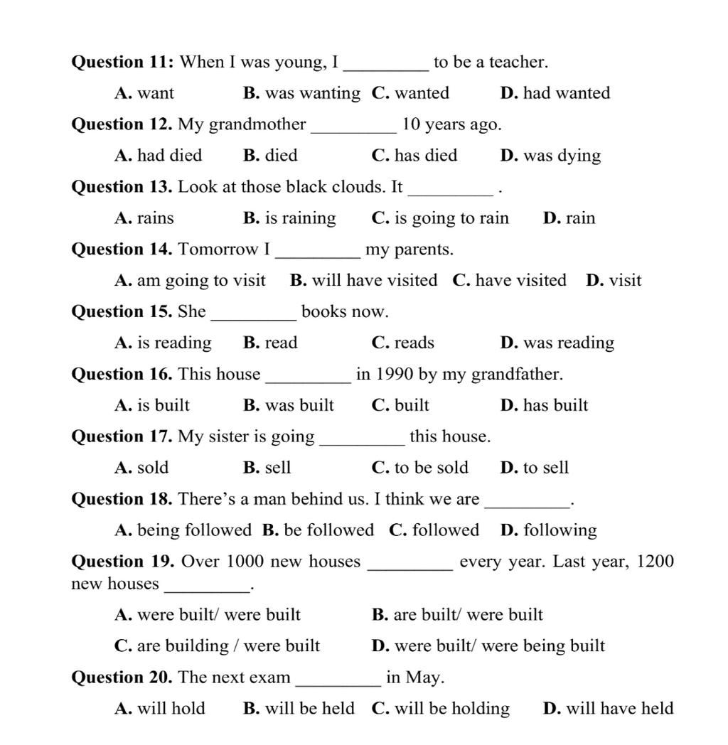 11. C (when I was young -> QKĐ, S V2/ed)
