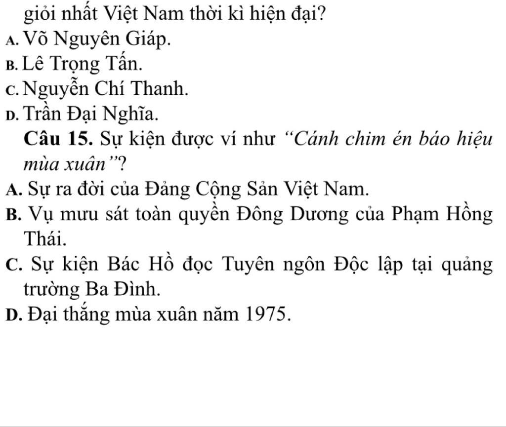 Câu 15: Sự kiện được ví như "Cánh chim én báo hiệu mùa xuân"?