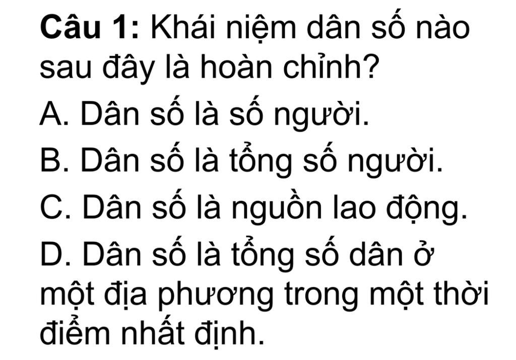 => D. Dân số là tổng số dân ở một địa phương trong một thời điểm nhất định.