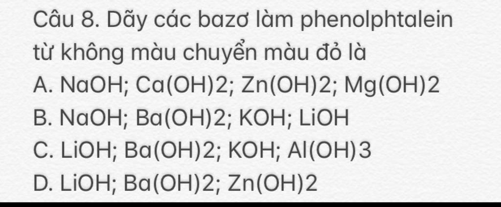 Dãy `B` là các bazo tan mà các bazo tan thì làm phenolphtalein hóa đỏ nên chọn `B`.