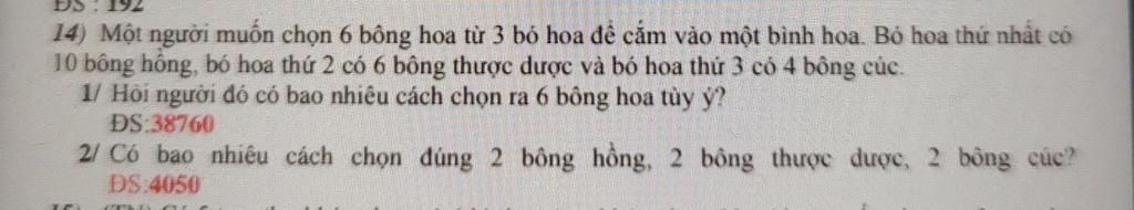 14) Một người muốn chọn 6 bông hoa từ 3 bó hoa để căm vào một bình hoa. Bó hoa thứ nhất có