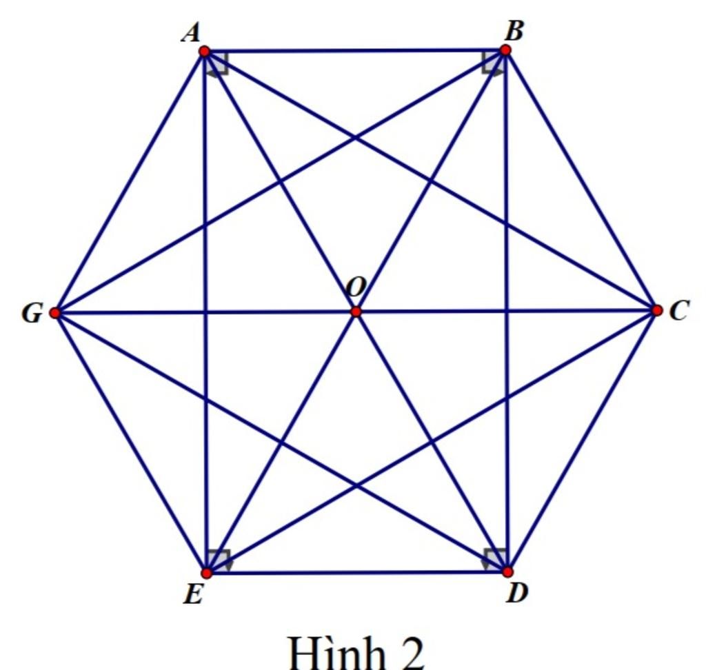 Kẻ các đường chéo phụ của hình lục giác đều ( như hình 2). Người ta dùng 2 màu xanh hoặc đỏ để tô các cạnh hoặc đường chéo của hình lục giác đều ở hình 2. Hãy giải thích vì sao trên hình 2 luôn xuất hiện ít nhất một hình tam giác có 3 cạnh được