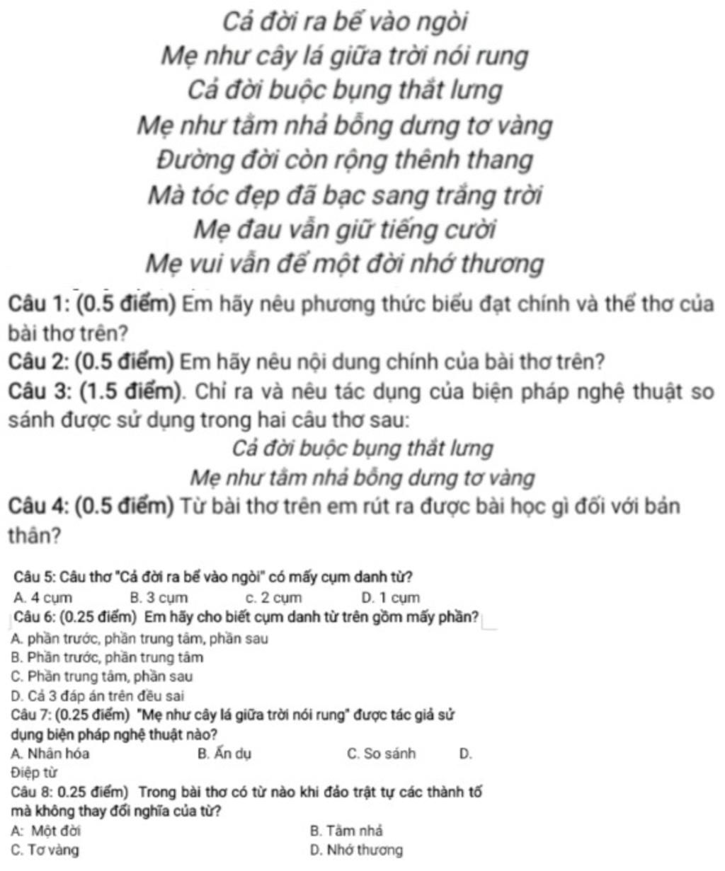 Câu 2:Nội dung chính của bài thơ là:Miêu tả về người mẹ,cảm xúc của người mẹ,cảm nghĩ cảu tác giả về người mẹ mình.