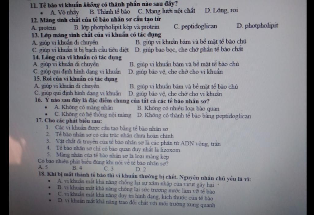 11. Tế bào vi khuấn không có thành phần nào sau đây?
