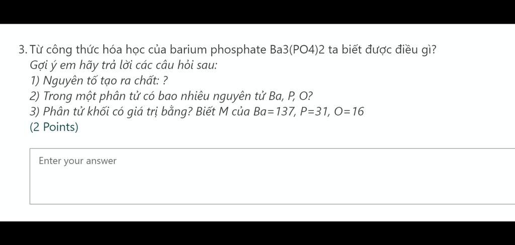 Ba_3(PO_4)_2 được tạo nên từ 3 nguyên tố hoá học: Ba, P, O Trong 1 phân tử Ba_3(PO_4)_2 có 3 nguyên tử Ba, 2 nguyên tử P, 8 nguyên tử O M_{Ba_3(PO_4)_2}=137.3+31.2+16.8=601 đvC