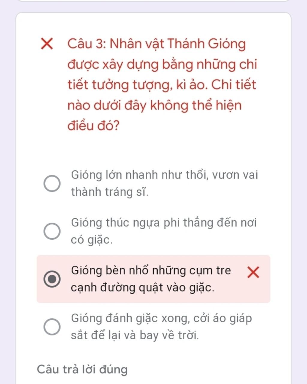 Câu bạn chọn sai vì: tre rất khó nhổ, 1 người bình thường không thể nhổ những cụm tre một cách dễ dàng được nên đây là chi tiết tưởng tượng, kì ảo.