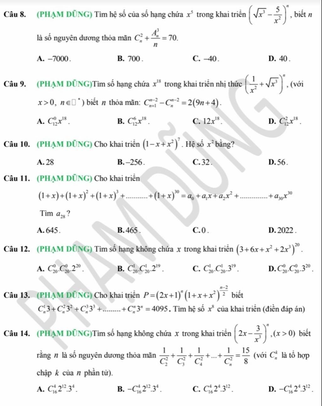 Câu 9. (PHẠM DŨNG)Tìm số hạng chứa x" trong khai triển nhị thức