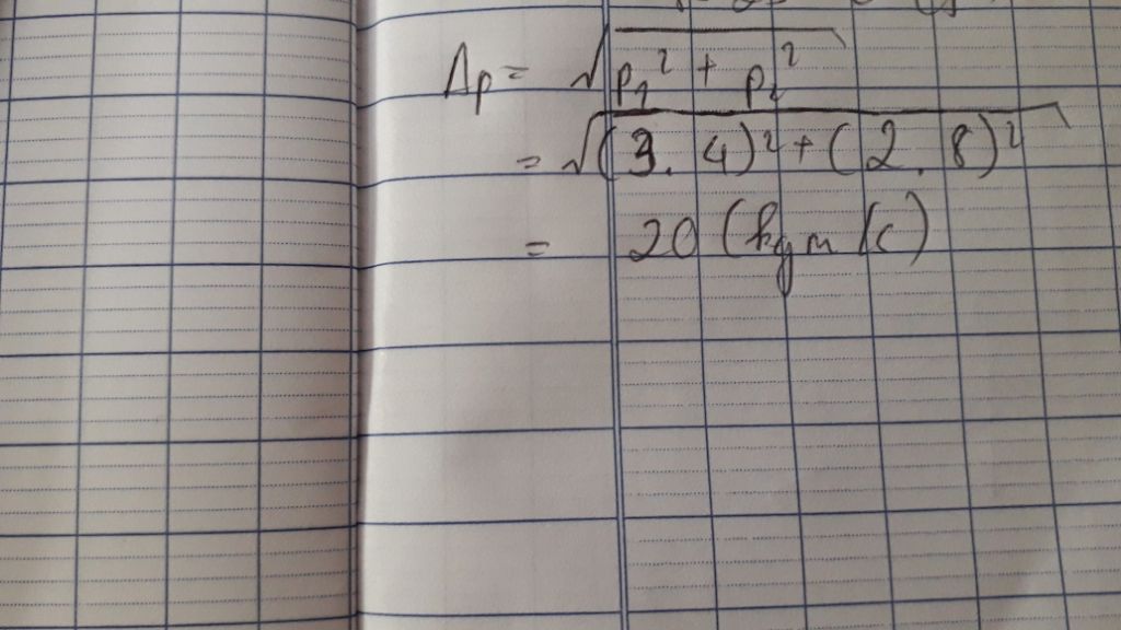 Động lượng của hệ có độ lớn: $p=\sqrt[]{p_1^{2}+p_2^{2}} = \sqrt[]{12^{2}+16^{2}}$ $=20(kgm/s)$