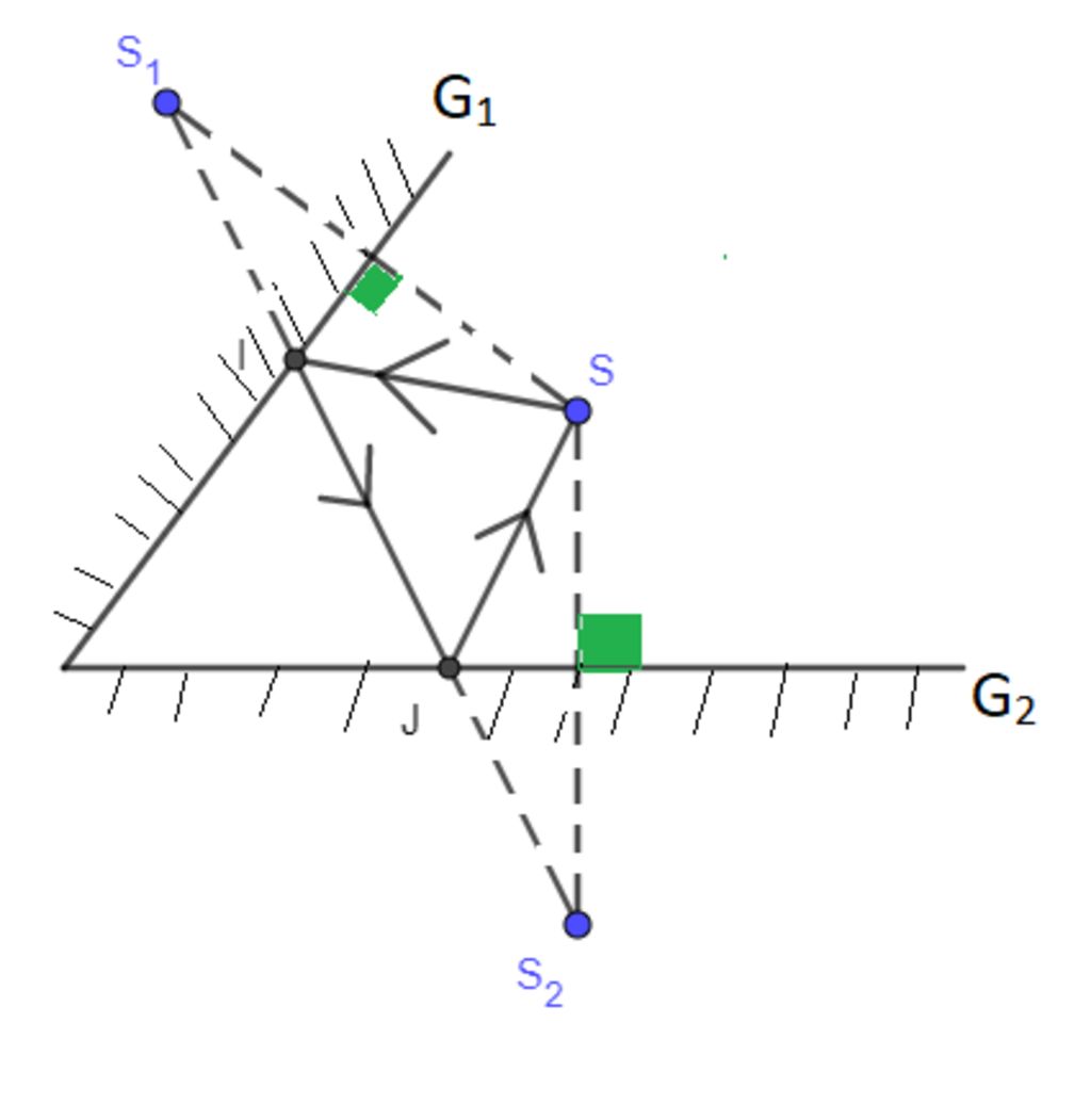 + Từ S2 nối đến S cắt gương G2 tại K, nối S1 đến K cắt gương G1 tại I, từ I nối đến S ta được đường truyền SIK qua 2 gương phản xạ lần lượt trên gương G1 và tia phản xạ cuối cùng đi qua S.