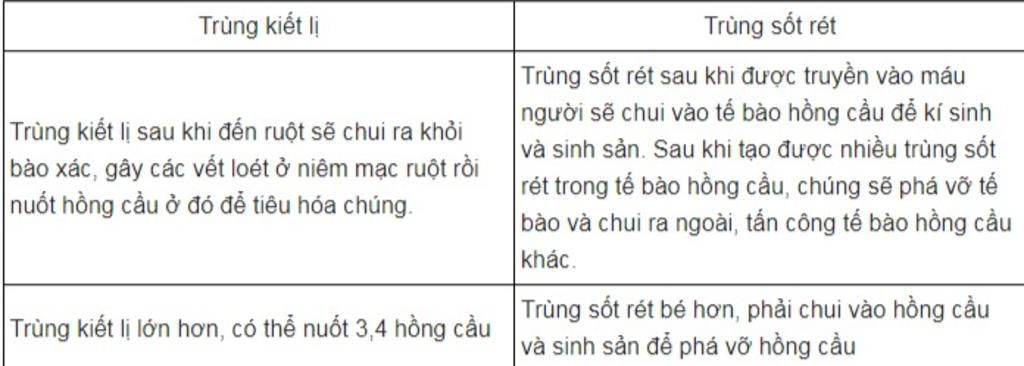 - Trùng sốt rét sau khi được truyền vào máu người sẽ chui vào tế bào hồng cầu để kí sinh và sinh sản. Sau khi tạo được nhiều trùng sốt rét trong tế bào hồng cầu, chúng sẽ phá vỡ tế bào và chui ra ngoài, tấn công tế bào hồng cầu khác.