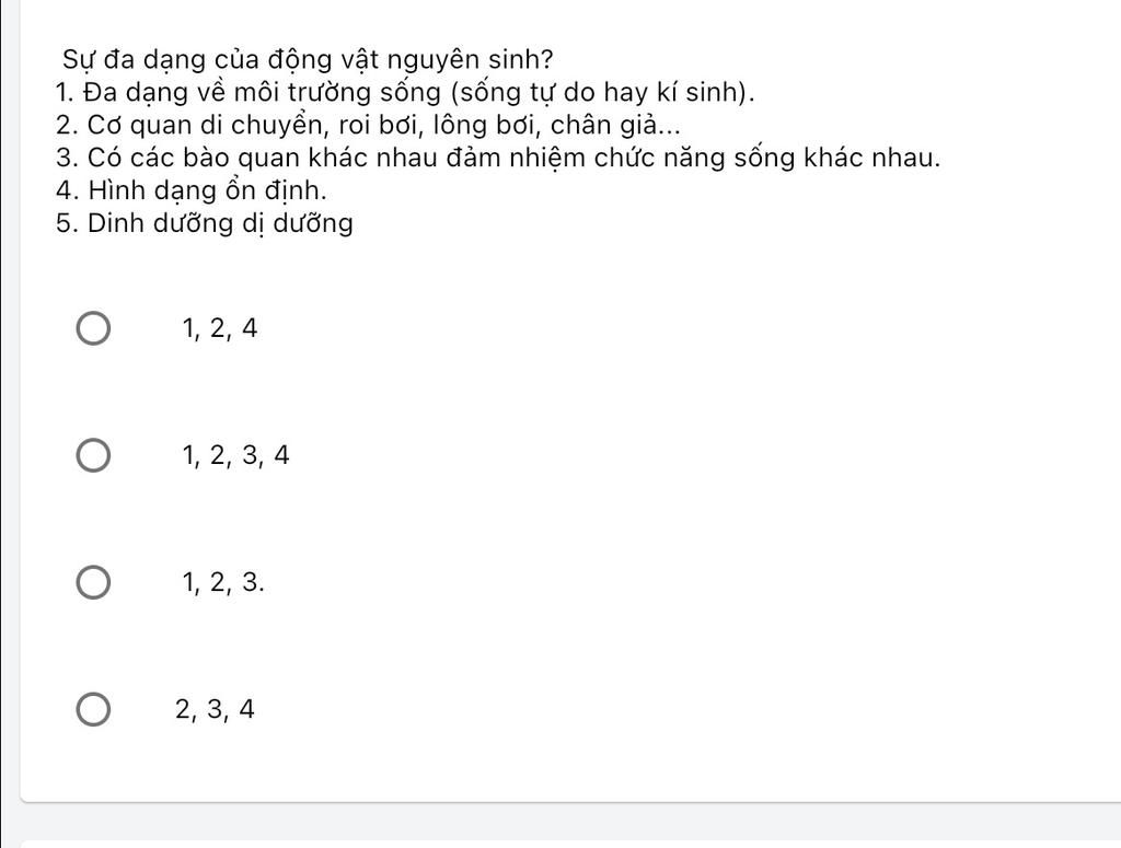 `->` Giải thích: Động vật nguyên sinh rất đa dạng về môi trường sống (tự do hoặc kí sinh), có nhiều loại cơ quan di chuyển khác nhau (roi bơi, lông bơi, chân giả), và các bào quan của chúng đảm nhiệm nhiều chức năng sống khác nhau. Hình dạng của chúng không phải lúc nào cũng ổn định (ví dụ trùng biến hình có hình dạng thay đổi). Dinh dưỡng dị dưỡng là một đặc điểm chung, nhưng không phải là yếu tố chính thể hiện sự đa dạng về cấu trúc hay môi trường sống như các điểm 1, 2, 3.