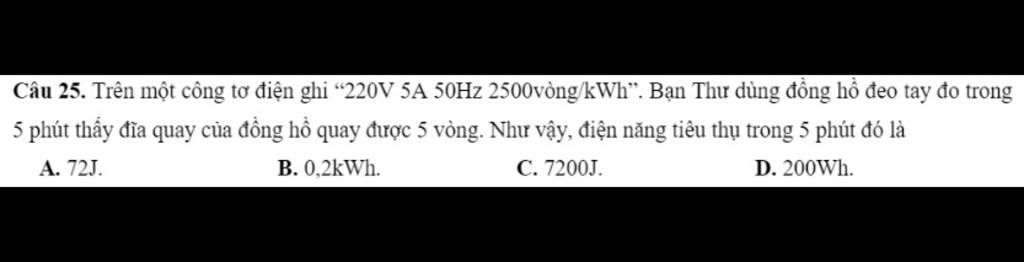 \(A = \dfrac{5}{{2500}}.1 = \dfrac{1}{{500}}kWh = 7200J\)