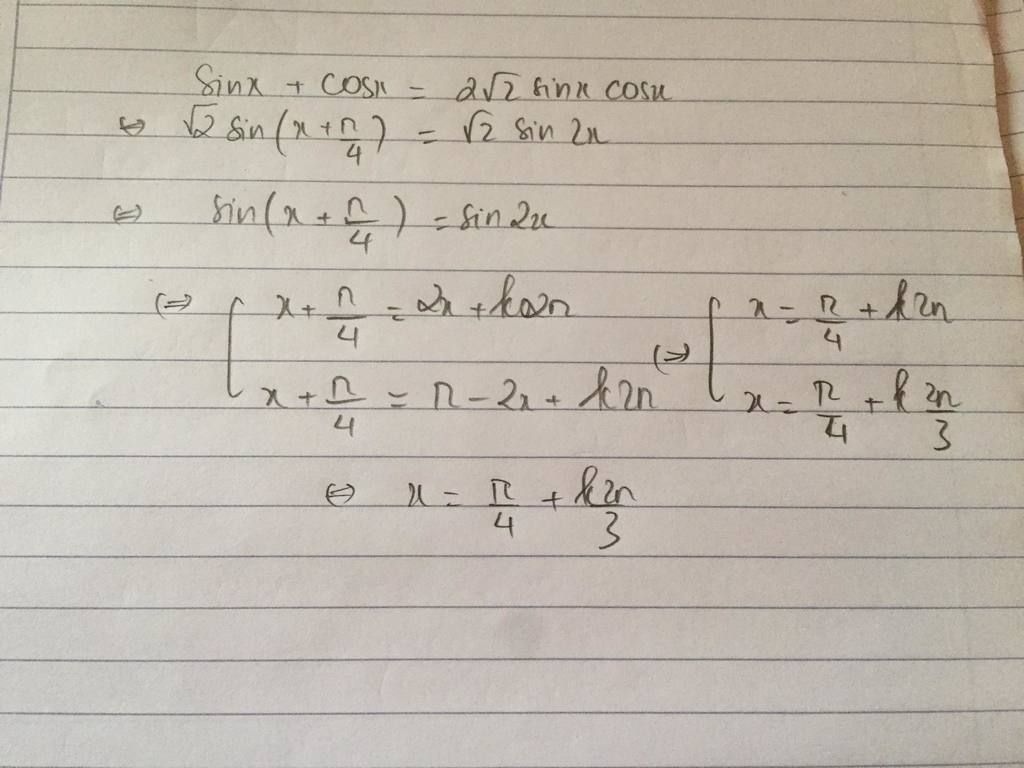 $\Leftrightarrow\left[\begin{array}{I}x+\dfrac{\pi}4=2x+k2\pi\\x+\dfrac{\pi}4=\pi-2x+k2\pi\end{array}\right.\Leftrightarrow\left[\begin{array}{I}x=\dfrac{\pi}4+k2\pi\\x=\dfrac{\pi}4+\dfrac{k2\pi}3\end{array}\right.$