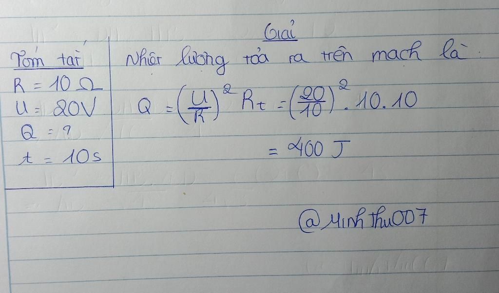 `Q=I^2 .R.t=U/R .U.t={U^2}/R .t={20^2}/10 .10=400J`