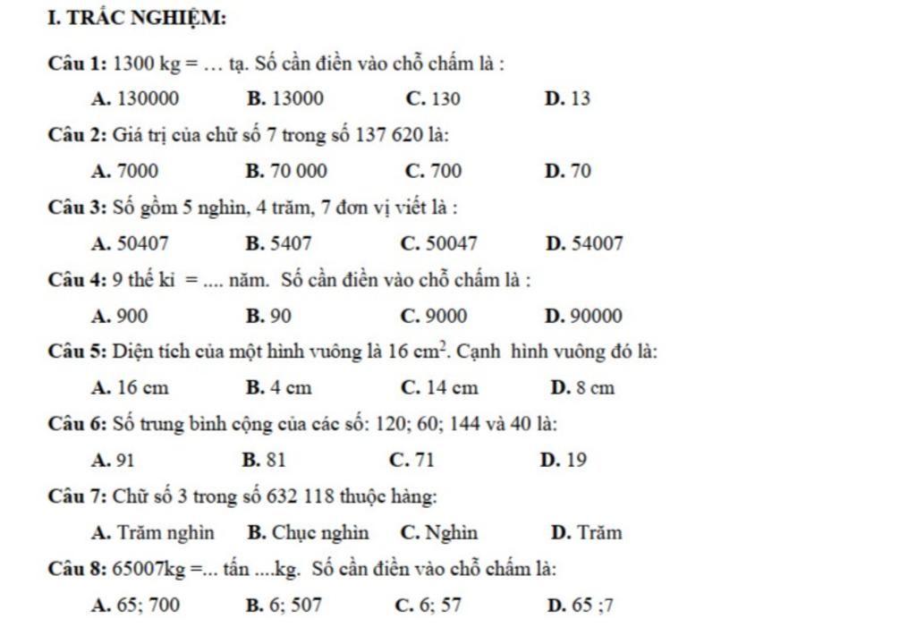 Câu 8: 65007kg tấn ...kg. Số cần điền vào chỗ chấm là:...